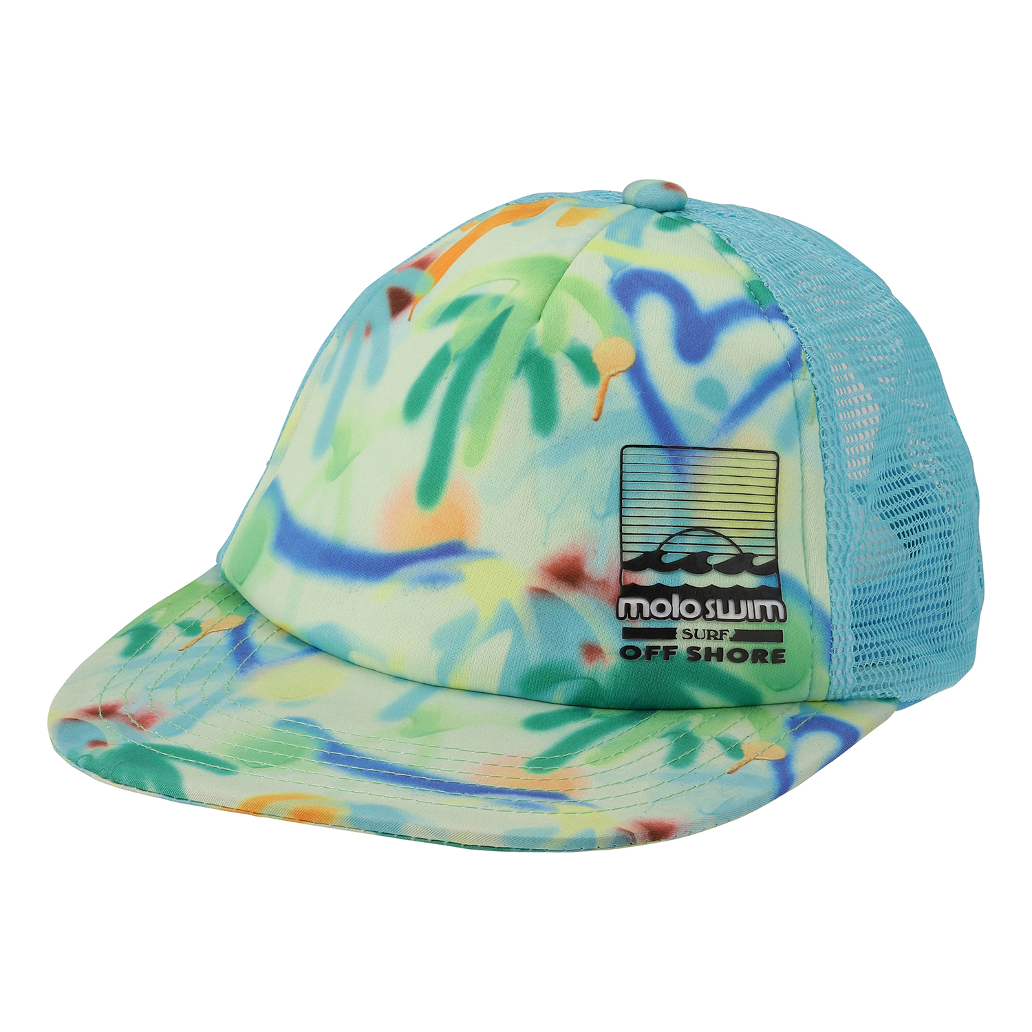 Grøn og turkis, cool kasket med spraymalet palmeprint i forskellige farver. Kasketten har net-bagside i turkis og kan justeres i nakken.