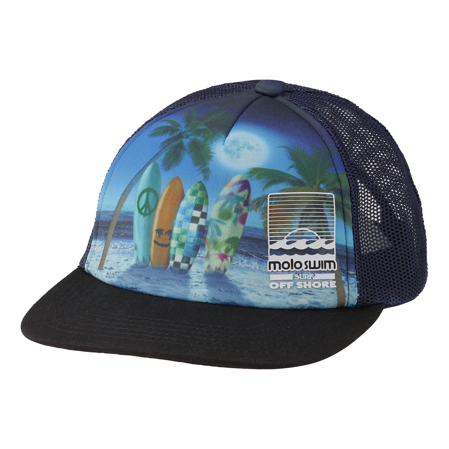 Sort, cool kasket med surfbræt-print i blå nuancer. Kasketten har net-bagside i sort og kan justeres i nakken.