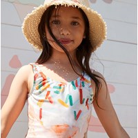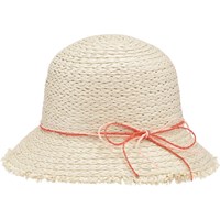 Lys stråhat med to tynde bindebånd i lyserød og rød. Hatten skærmer for solens stråler og passer perfekt til en tur på stranden.