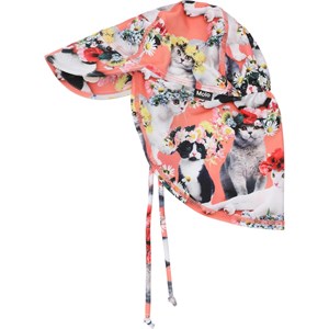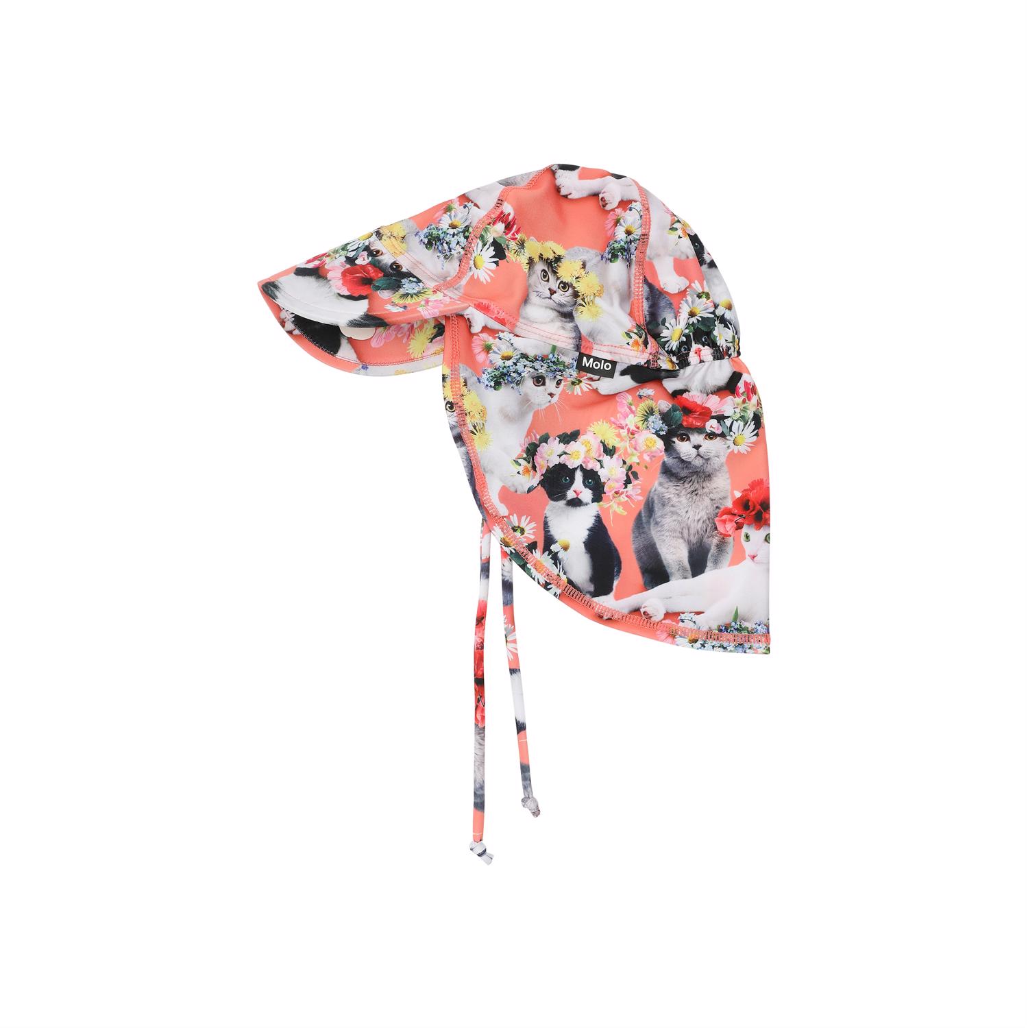 Solhat med UV beskyttelse 50+, bred skygge og længde i nakken, som beskytter barnet på bedste måde. Solhatten er med humoristisk print af katte med blomsterkranse om hovedet. Dette Molo produkt er recycled og fremstillet af REPREVE genanvendeligt polyester. REPREVE er det førende og mest anerkendte materiale indenfor genanvendelige fibre og er produceret af brugte plastikflasker og andet restaffald.Produktionen af genanvendt polyester kræver langt færre ressourcer og udleder mindre CO2, hvorfor Molo’s recycled badetøj er det bæredygtige valg.