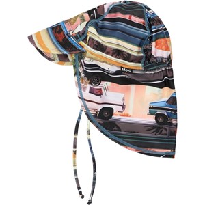 Solhat med UV beskyttelse 50+, bred skygge og længde i nakken, som beskytter barnet på bedste måde. Solhatten er med print af biler i flotte farver. Dette Molo produkt er recycled og fremstillet af REPREVE genanvendeligt polyester. REPREVE er det førende og mest anerkendte materiale indenfor genanvendelige fibre og er produceret af brugte plastikflasker og andet restaffald.Produktionen af genanvendt polyester kræver langt færre ressourcer og udleder mindre CO2, hvorfor Molo’s recycled badetøj er det bæredygtige valg.