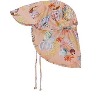 Solhat med UV beskyttelse 50+, bred skygge og længde i nakken, som beskytter barnet på bedste måde. Solhatten er med fint print af strandskaller.
