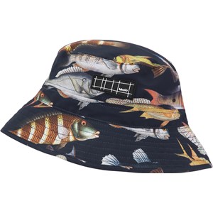 Mørkeblå bøllehat med print af fisk og UV beskyttelse 50+, som beskytter barnet mod solen. Bøllehatten er et uundværligt sommer accessoires og liver et hvert outfit op. Solhatten er her med tigerstribeprint.