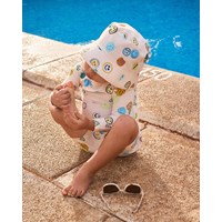 Bøllehat i genanvendt nylon med UV-beskyttelse 50+. Hatten har en normal pasform med lufthuller og er ideel at tage med til vandet, da materialet tørrer hurtigt. Bøllehatten er beige med et allover print af farverige, smilende ansigter.