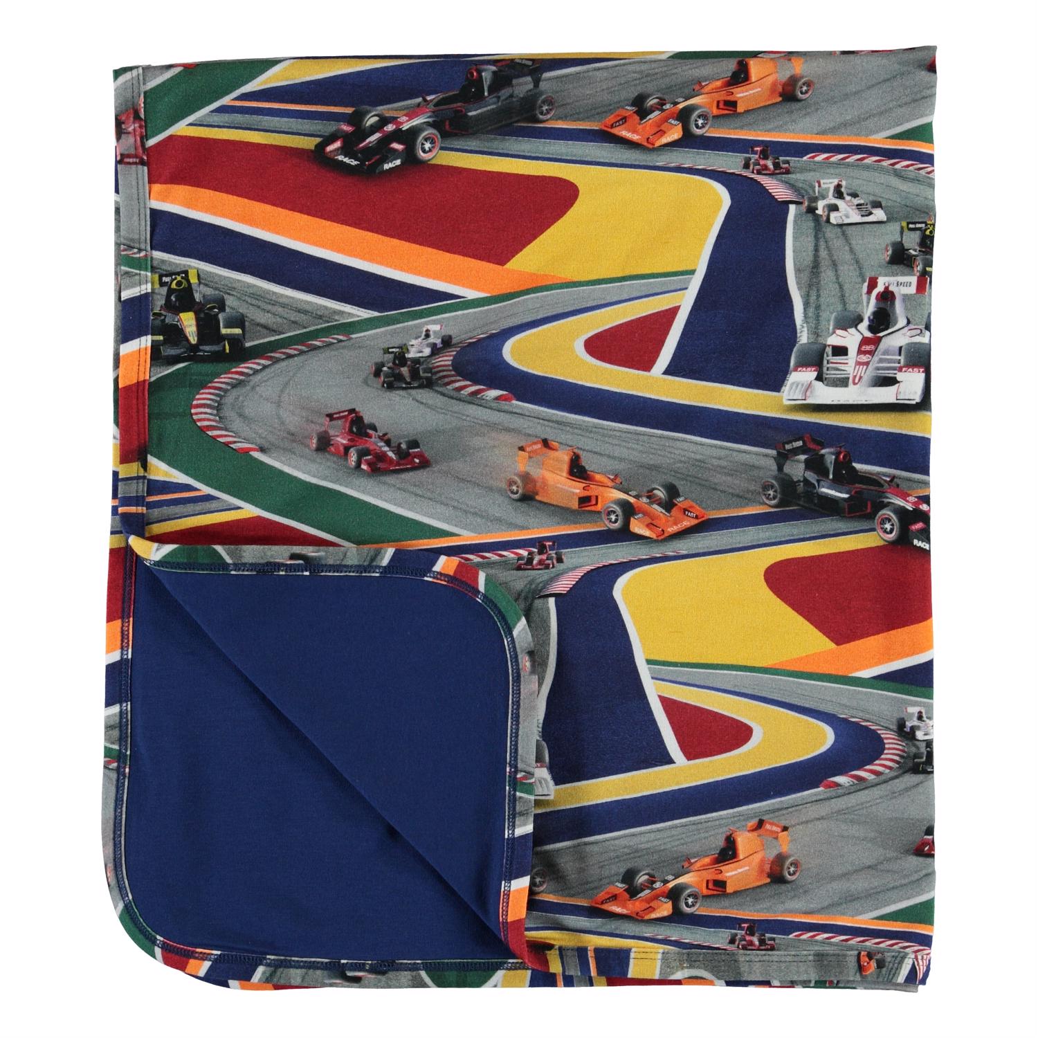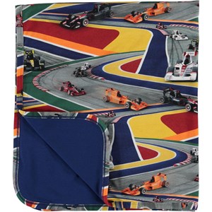 Blødt, dobbeltlaget bomuldstæppe i flotte farver og med print af hurtige racerbiler. Tæppet har grå bagside.
