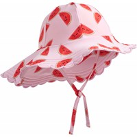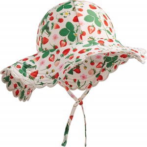 Strækbar solhat til de mindste i genanvendt polyester med UV-beskyttelse 50+. Solhatten har en normal pasform, en smal elastisk snor om halsen samt en bred skygge, der beskytter mod solens stråler. Solhatten er hvid med et allover-print af friske jordbærplanter.