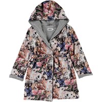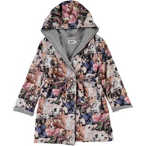 Blød badekåbe med print af små hunde med sløjfer om halsen. Badekåben er foret med en tynd og blød frotté, har to lommer, bindebånd i taljen samt en stor hætte til at holde nakken og hovedet ekstra varmt. Certificeret af Ecocert Greenlife, certifikationsnr. 197496.