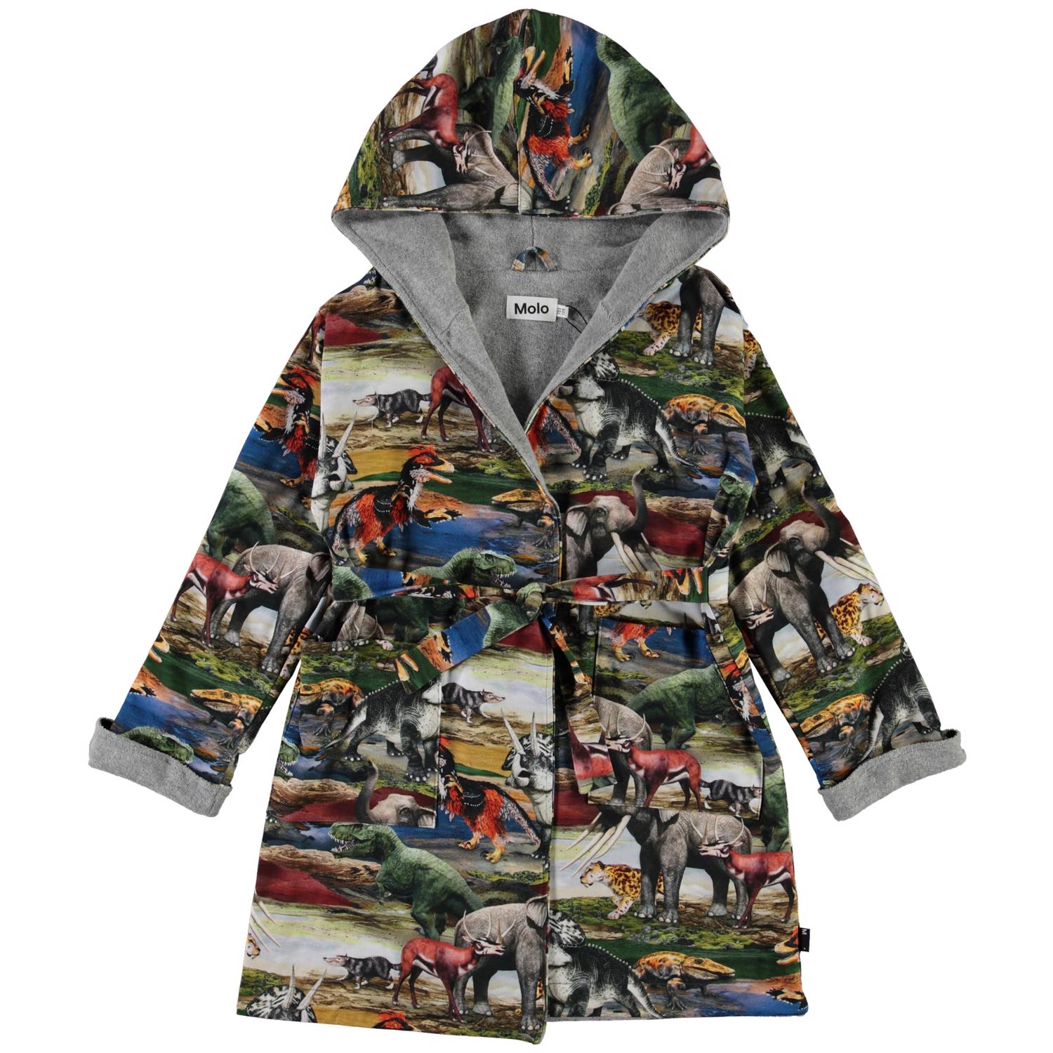 Blød badekåbe med print af fortidens dyr. Badekåben er foret med en tynd og blød frotté, har to lommer, bindebånd i taljen samt en stor hætte til at holde nakken og hovedet ekstra varmt. Certificeret af Ecocert Greenlife, certifikationsnr. 197496.