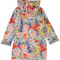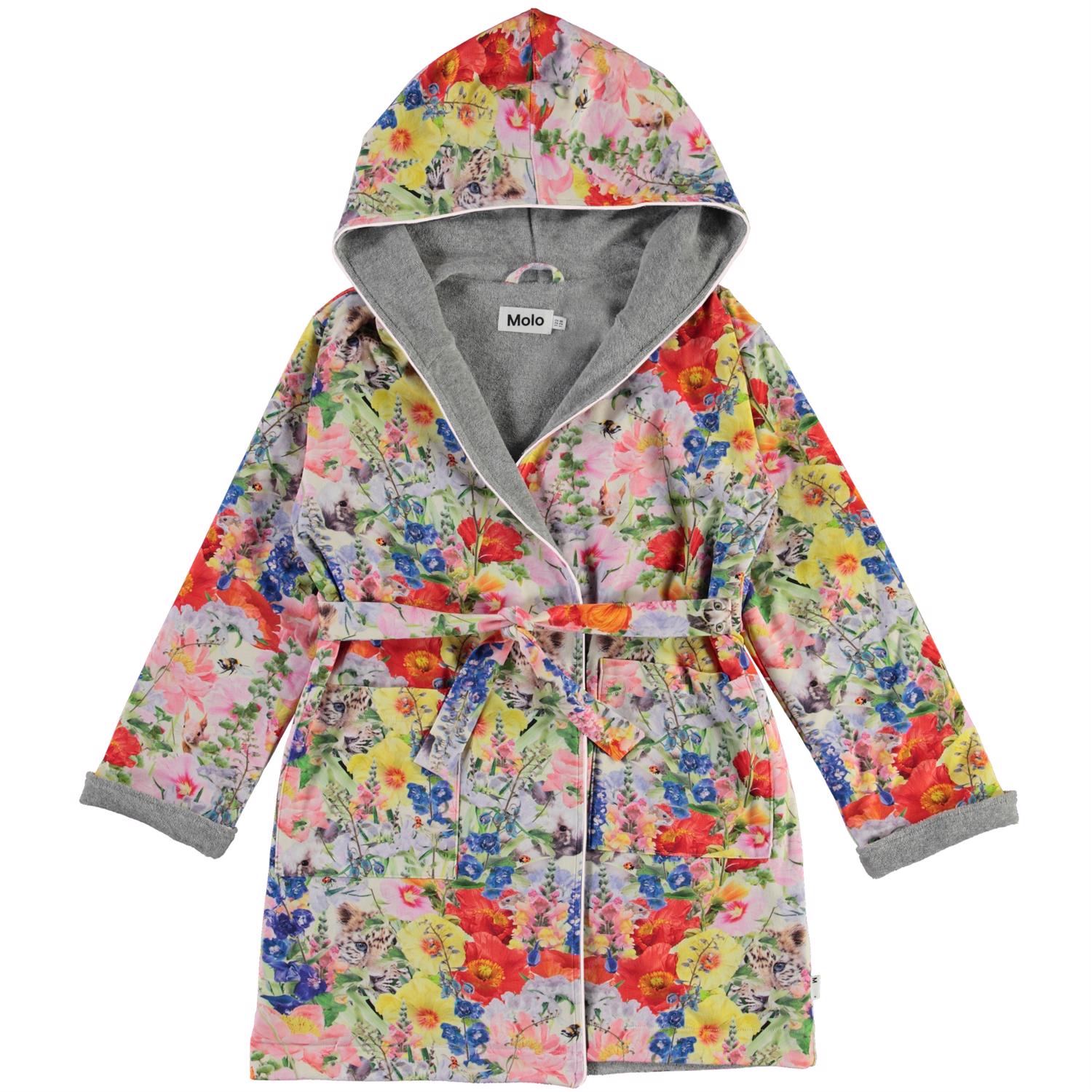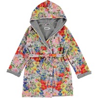 Blød badekåbe med blomster print. Badekåben er foret med en tynd og blød frotté, har to lommer, bindebånd i taljen samt en stor hætte til at holde nakken og hovedet ekstra varmt. Certificeret af Ecocert Greenlife, certifikationsnr. 197496.