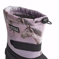 Praktiske vinterstøvler med en kraftig og skridsikker sort sål, med print af heste på en drømmende bagrund i lyserøde og lilla nuancer. Støvlerne har en justerbar elastik øverst i skaftet, justerbar velcro omkring anklen, en indevendig sok samt en god højde og egner sig derfor godt til alt slags vejr.