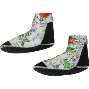 Neopren badesokker, som beskytter de små fødder mod skarpe genstande og varmt sand. Disse badesokker er med print af engblomster på lys baggrund med sort bund.