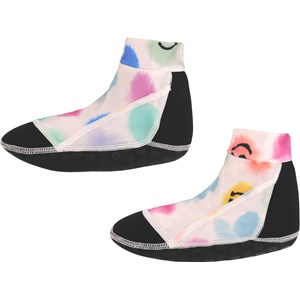 Sorte badesokker med lyserødt emoji-print. De giver god beskyttelse til små fødder mod skarpe genstande og varmt sand. De er fremstillet af genanvendt, elastisk polyester, hvilket gør dem nemme at tage af og på. Molo's badetøj har en høj UV-beskyttelse på 50+."
