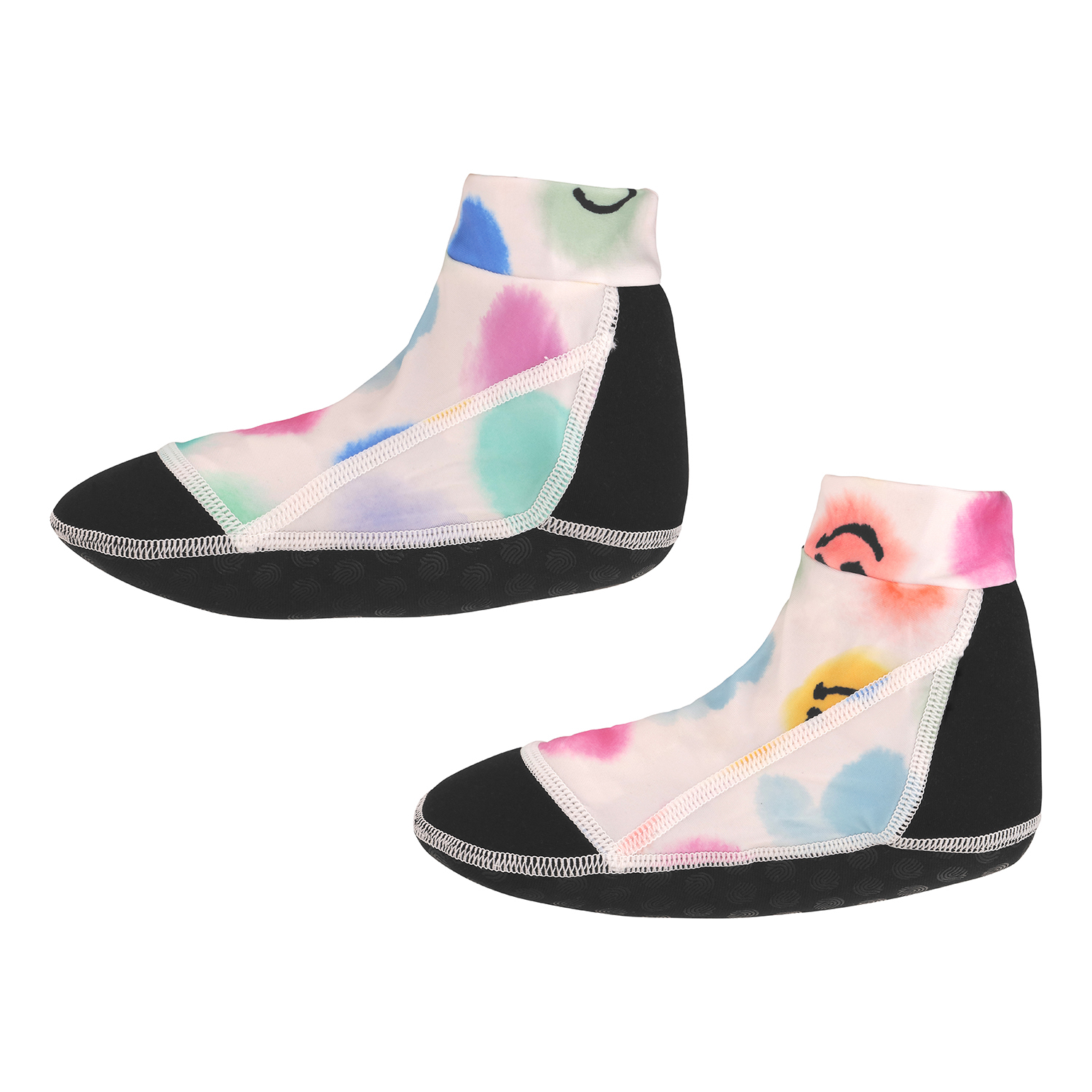 Sorte badesokker med lyserødt emoji-print. De giver god beskyttelse til små fødder mod skarpe genstande og varmt sand. De er fremstillet af genanvendt, elastisk polyester, hvilket gør dem nemme at tage af og på. Molo's badetøj har en høj UV-beskyttelse på 50+."