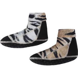 Neopren badesokker, som beskytter de små fødder mod skarpe genstande og varmt sand. Disse badesokker er med print af tigerstriber og sort bund.