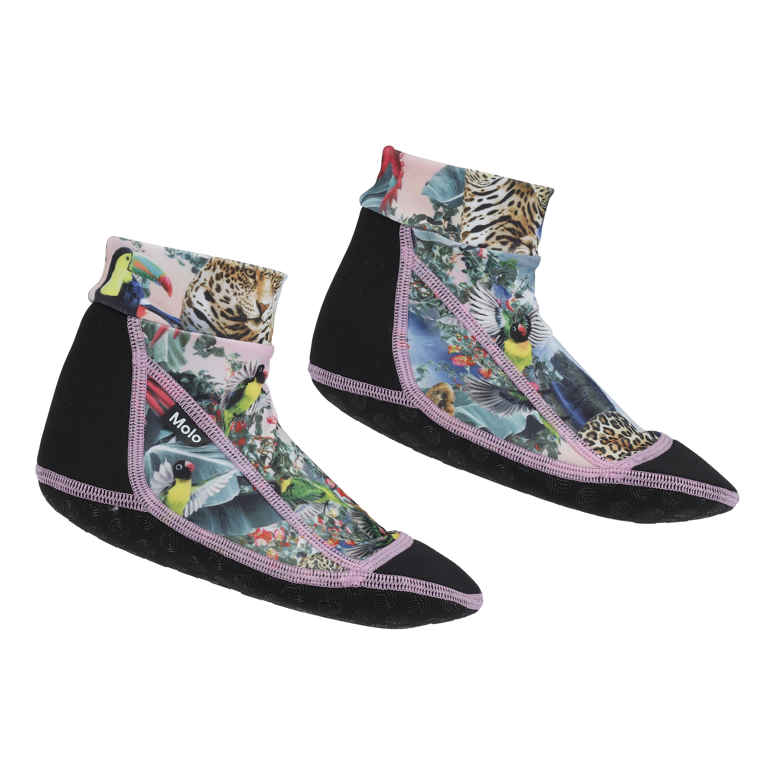 Neopren badesokker, som beskytter de små fødder mod skarpe genstande og varmt sand. Badesokkerne er med printet 'Wild Amazon'.