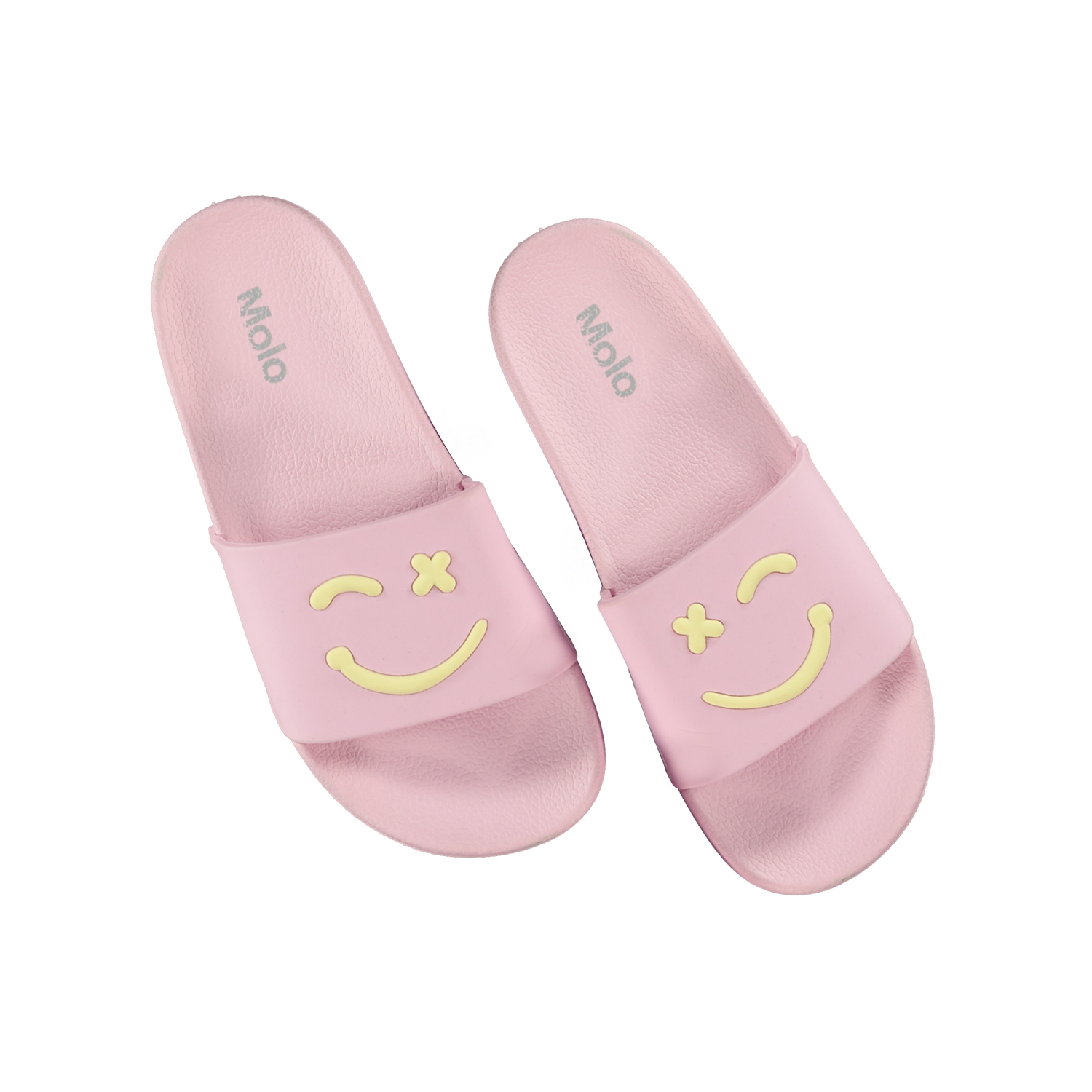 Molo's Zhappy sandaler er et must i sommervarmen når tæerne skal luftes. Disse slippers er i lyserød med en gul smiley. Sandalerne har desuden en elastisk strop omkring hælen i størrelserne 23/24 og 25/26