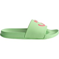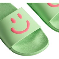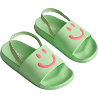 Badesandaler i grøn med pink smil, bred fodrem og formstøbt indersål. Vandafvisende og ideelle til pool og strand. Str. 23/24 og 25/26 har hælrem, der sikrer en stabil pasform til de mindste.