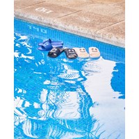 Sorte badesandaler med bred fodrem og formstøbt indersål. Sandalerne tåler vand og er derfor perfekte til poolen eller stranden. Fodremmen har et smilende ansigt med palmeøjne i hvid. Størrelserne 23/24 og 25/26 har en praktisk elastisk hælrem som sikrer en behagelig pasform.