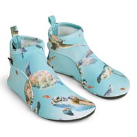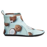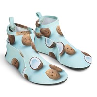 Lyseblå letvægtsbadesko til de mindste i genanvendt polyester, der beskytter små fødder mod skarpe skaller og småsten, når de udforsker havet for første gang. Badeskoen har en slidstærk og skridsikker gummisål som sikrer et godt fodfæste samt en trækstrop bagpå der gør dem lette at tage af og på. Trækstropper bagpå gør dem lette at tage af og på. Badeskoen har et allover-print af brune kokosnødder.