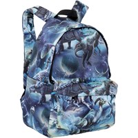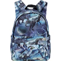 Blå rygsæk med et print af dinosaurer. Rygsækken har masser af opbevaringsplads, herunder en polstret lomme, der beskytter din computer eller tablet. Den er udstyret med en lynlåslomme på fronten, flaskelommer på begge sider og vatterede ryg- og skulderstropper. Derudover har den en justerbar brystrem, som sikrer en jævn vægtfordeling. Rygsækken har dimensionerne 30 x 17 x 42 cm og en volumen på 21L.