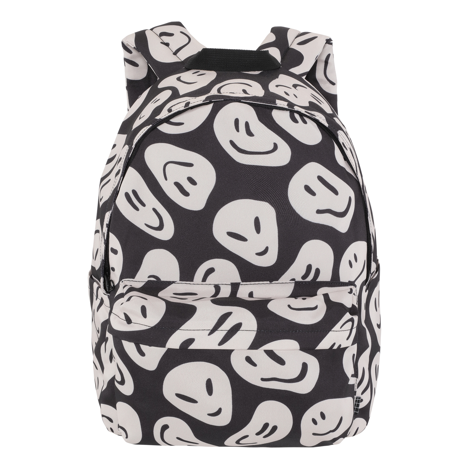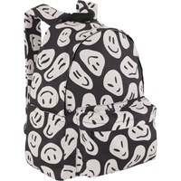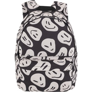 Rygsæk i sort med hvidt print af glade ansigter, hvoraf nogle ligner aliens. Rygsækken har masser af opbevaringsplads, herunder en polstret lomme, der beskytter din computer eller tablet. Den er udstyret med en lynlåslomme på fronten, flaskelommer på begge sider og vatterede ryg- og skulderstropper. Derudover har den en justerbar brystrem, som sikrer en jævn vægtfordeling. Dimensioner: 30 x 17 x 42. Volumen: 21L.