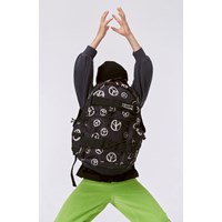 Rummelig rygsæk i sort med print af hvide peacetegn. Denne rygsæk er ideel til skateboardere, da den har to velcrobånd og et elastiksystem foran til at sikre skateboard og hjelm. Den har også to store rum, hvoraf det ene har en polstret lomme til en tablet eller bærbar computer og giver rigelig plads til skoleartikler. Tasken har en lynlåslomme på hver side, polstret ryg og skulderstropper for komfort samt en justerbar brystrem, der aflaster vægten på skuldrene. Dimensioner: 29 x 15 x 42. Volumen: 18L.