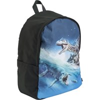 Sort og blå rygsæk med sejt dinosaurprint. Har polstret lomme til tablet eller computer, flaskelommer i siderne, vatterede skulderstropper og justerbar brystrem for god komfort. Dimensioner: 30 x 17 x 42. Volumen: 21L.