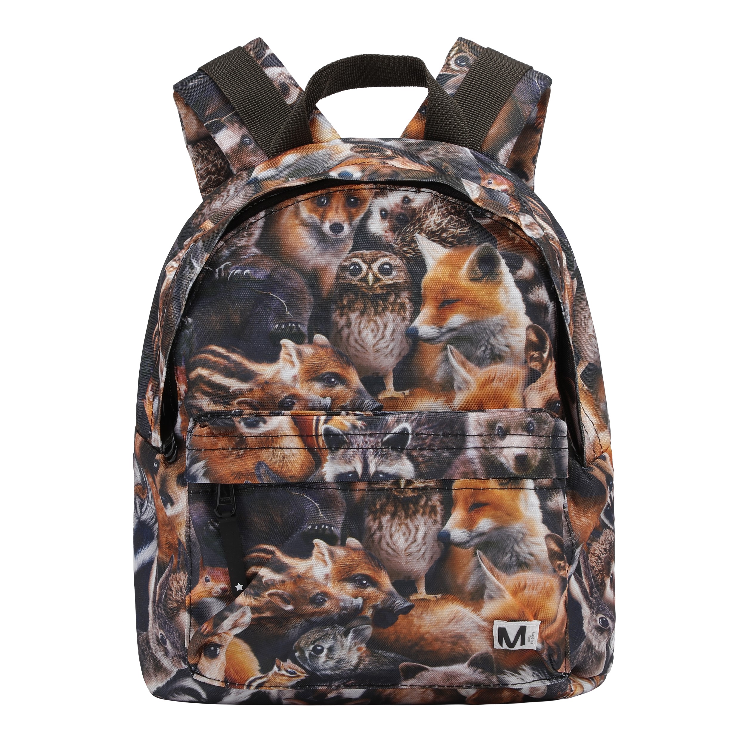 Rygsæk med print af skovens dyr. Rygsækken har en udvendig lomme, spænde foran brystet, hank, samt justerbare stropper. Dette Molo produkt er recycled og fremstillet af genanvendeligt polyester, som er produceret af brugte plastikflasker og andet restaffald. Produktionen af genanvendt polyester kræver langt færre ressourcer og udleder mindre CO2, hvorfor Molo’s recycled rygsække er det bæredygtige valg. Rygsækken måler 25 cm i bredden og 30 cm i højden og egner sig specielt til mindre børn.