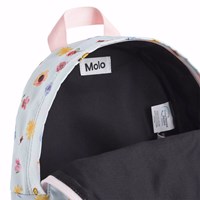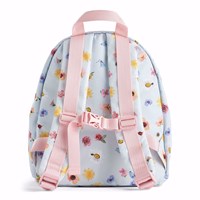 Lyseblå rygsæk med blomsterprint. Denne rygsæk er perfekt til små eventyrere i alderen 3-6 år, med ét stort opbevaringsrum og en praktisk lynlåslomme foran. Tasken har polstret ryg og skulderremme samt en justerbar brystrem for optimal komfort. Den er ideel som børnehavetaske og kan vokse med barnet, takket være de justerbare remme, hvilket gør den velegnet helt frem til første skoledag. Dimensioner: 26 x 10 x 30 cm. Volumen: 6,5L.
