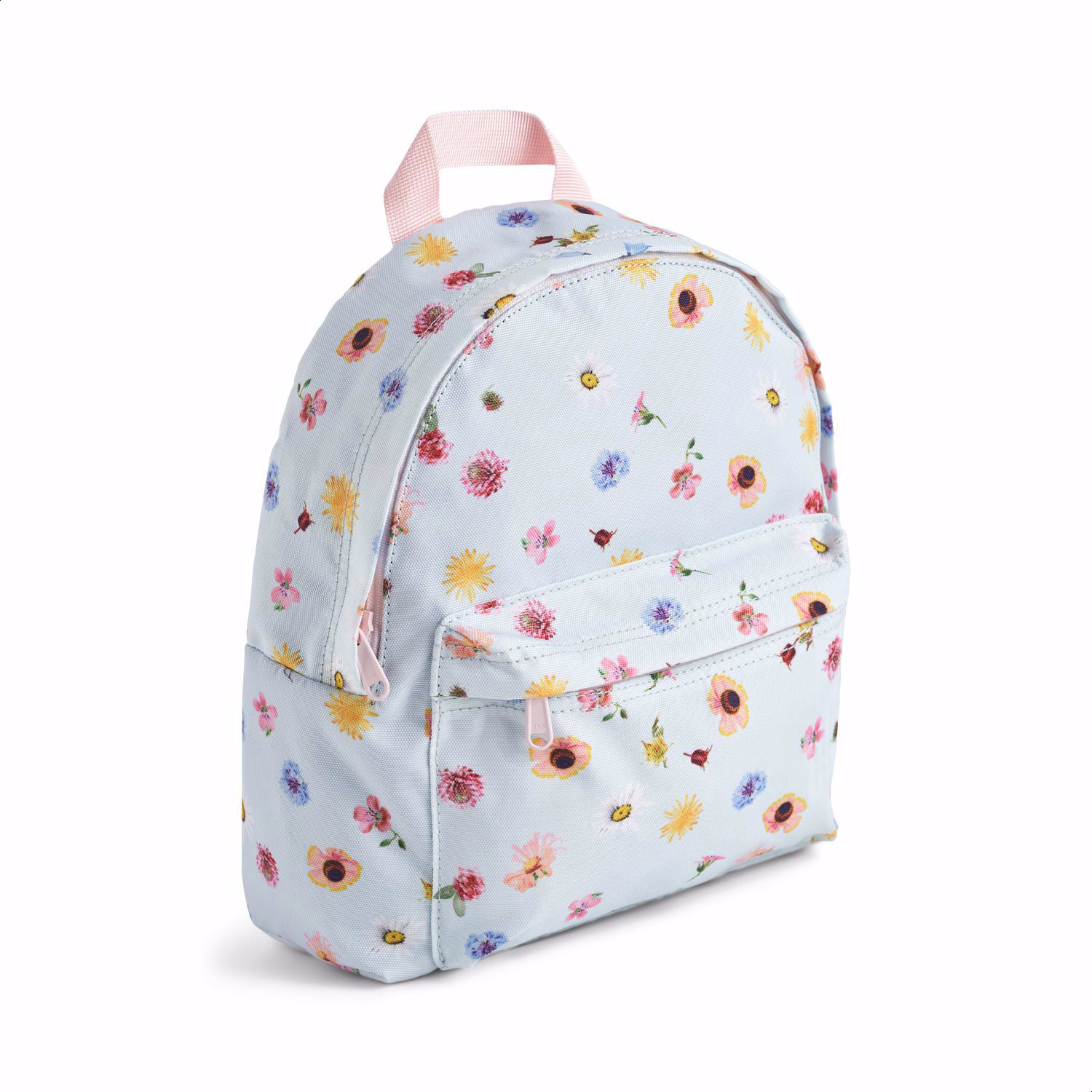 Lyseblå rygsæk med blomsterprint. Denne rygsæk er perfekt til små eventyrere i alderen 3-6 år, med ét stort opbevaringsrum og en praktisk lynlåslomme foran. Tasken har polstret ryg og skulderremme samt en justerbar brystrem for optimal komfort. Den er ideel som børnehavetaske og kan vokse med barnet, takket være de justerbare remme, hvilket gør den velegnet helt frem til første skoledag. Dimensioner: 26 x 10 x 30 cm. Volumen: 6,5L.