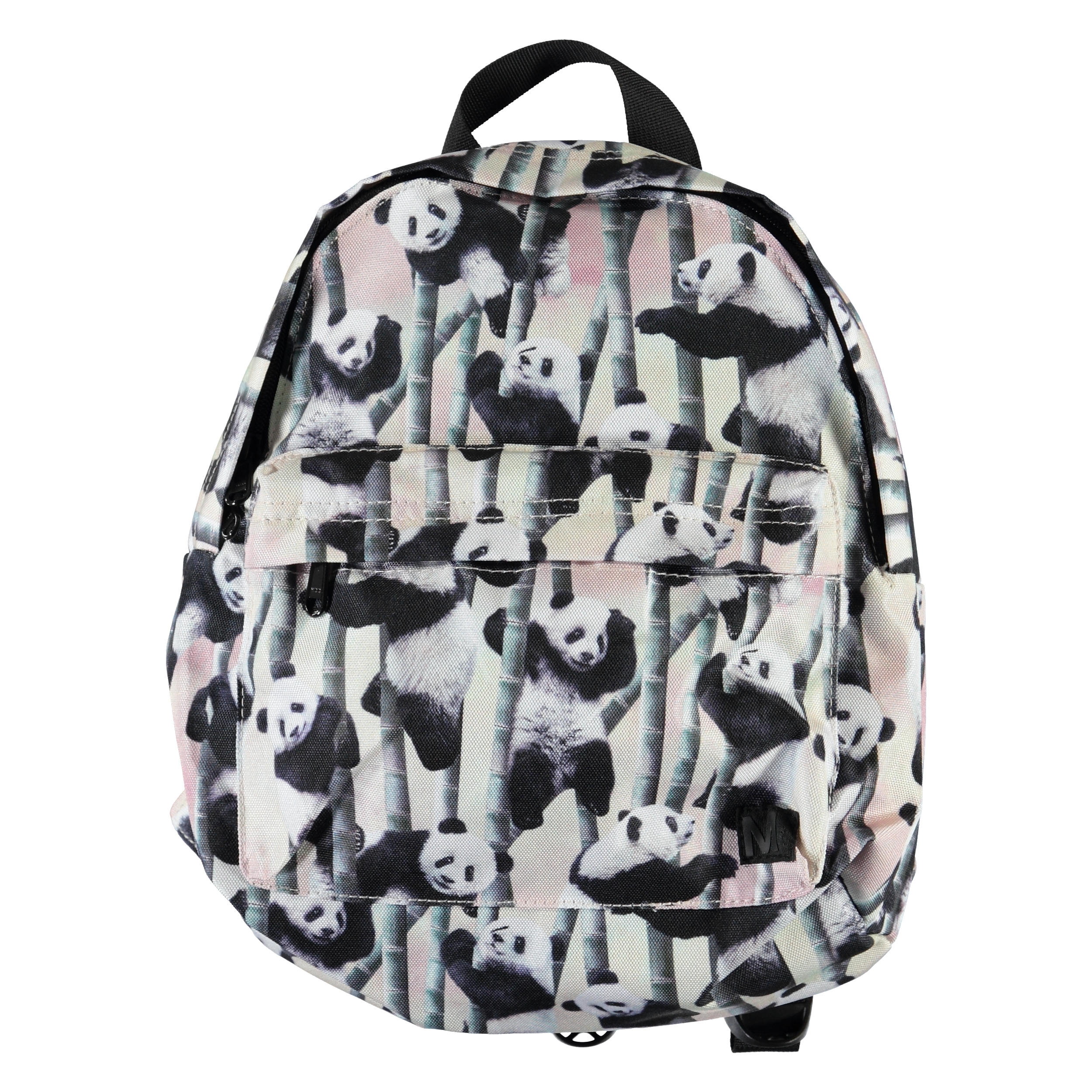 Rygsæk med med print af panda bjørne. Rygsækken har en udvendig lomme med lynlås, spænde foran brystet, hank til ophæng samt justerbare stropper.
