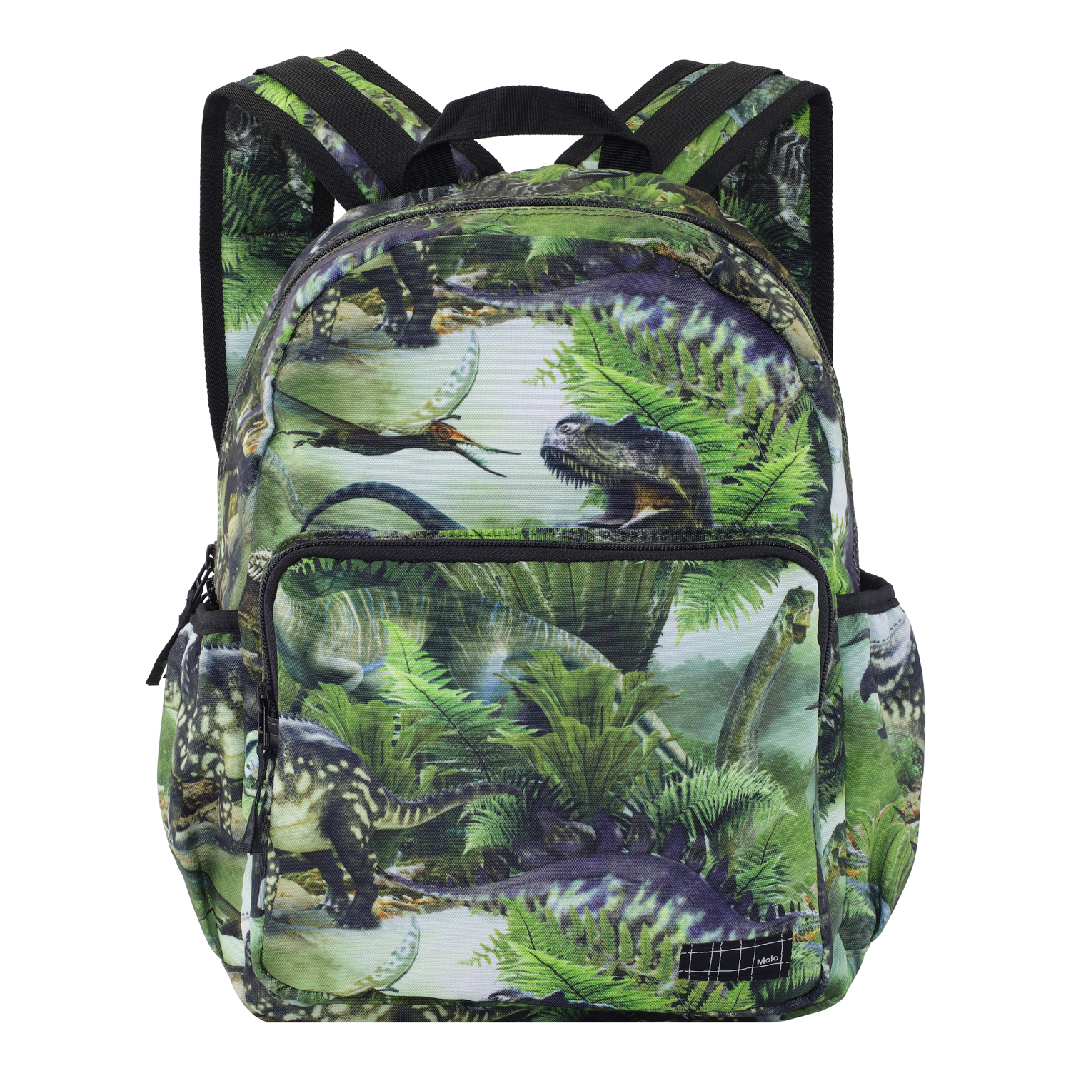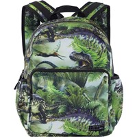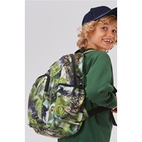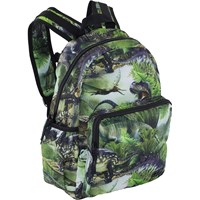 Rummelig rygsæk i grøn med print dinosauer. Rygsækkens materiale er fremstillet af recycled polyester. Rygsækken har en udvendig frontlomme med lynlås, lommer i begge sider til eksempelvis en drikkedunk, vatteret ryg, strop til ophæng samt justerbare skulderstropper. Rygsækken måler ca. 18 cm i bredden og ca. 37 cm i højden.