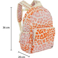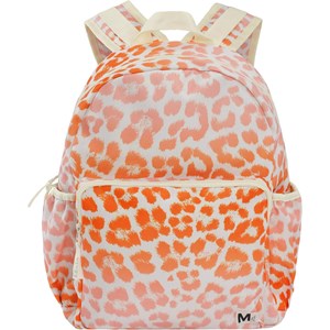 Rummelig rygsæk i orange og rosa stribet jaguarprint på cremefarvet baggrund. Rygsækkens materiale er fremstillet af recycled polyester. Rygsækken har en udvendig frontlomme med lynlås, lommer i begge sider til eksempelvis en drikkedunk, vatteret ryg, strop til ophæng samt justerbare skulderstropper og en indvendig lomme. Dette Molo produkt er recycled og fremstillet af genanvendeligt polyester, som er produceret af brugte plastikflasker og andet restaffald. Produktionen af genanvendt polyester kræver langt færre ressourcer og udleder mindre CO2, hvorfor Molo’s recycled rygsække er det bæredygtige valg. Tasken måler 17cm. x 39cm. x 32cm.
