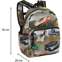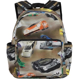 Rummelig rygsæk i lys brun med print af forskellige farverige sportsvogne . Rygsækkens materiale er fremstillet af recycled polyester. Rygsækken har en udvendig frontlomme med lynlås, lommer i begge sider til eksempelvis en drikkedunk, vatteret ryg, strop til ophæng samt justerbare skulderstropper og en indvendig lomme. Dette Molo produkt er recycled og fremstillet af genanvendeligt polyester, som er produceret af brugte plastikflasker og andet restaffald. Produktionen af genanvendt polyester kræver langt færre ressourcer og udleder mindre CO2, hvorfor Molo’s recycled rygsække er det bæredygtige valg. Tasken måler 17cm. x 39cm. x 32cm.