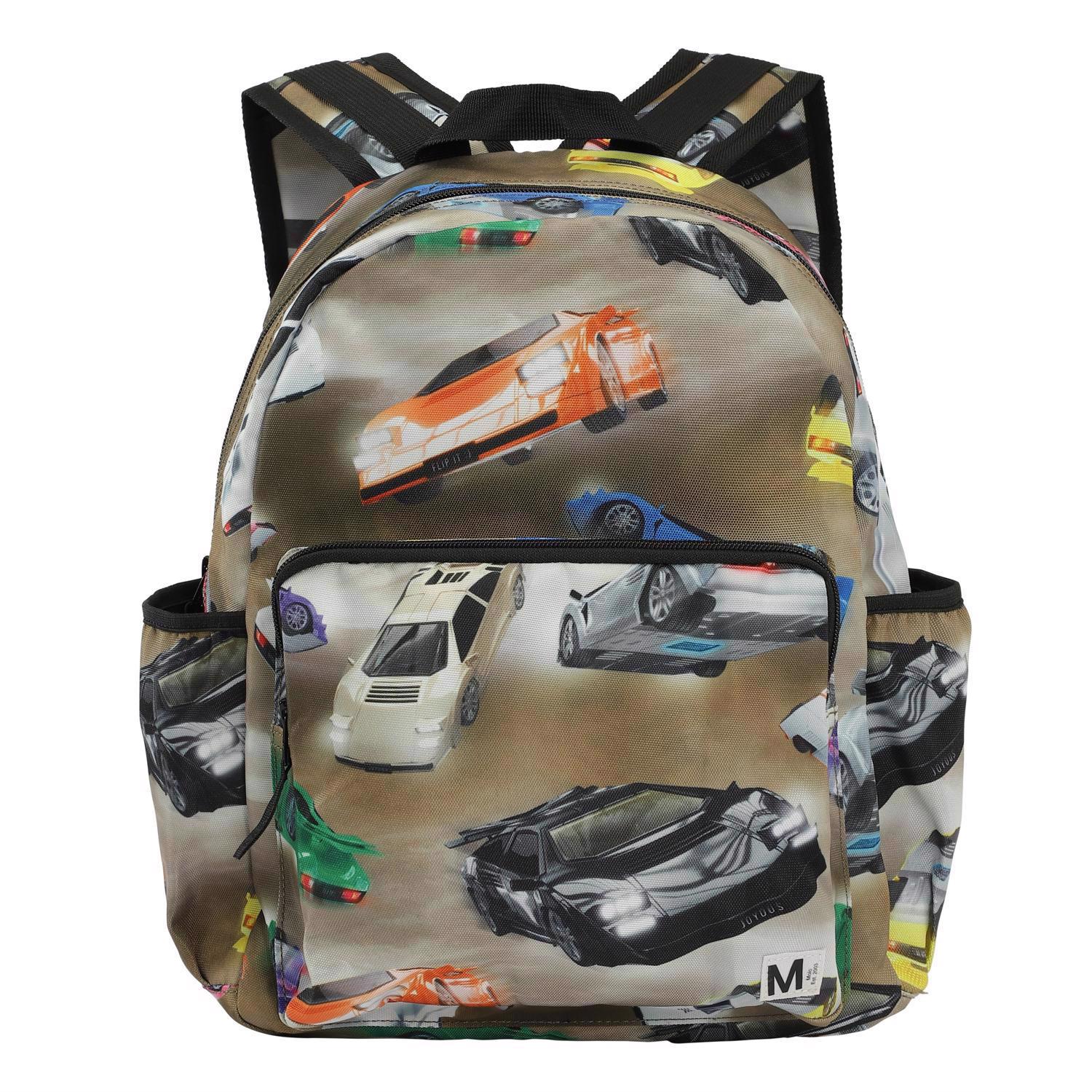 Rummelig rygsæk i lys brun med print af forskellige farverige sportsvogne . Rygsækkens materiale er fremstillet af recycled polyester. Rygsækken har en udvendig frontlomme med lynlås, lommer i begge sider til eksempelvis en drikkedunk, vatteret ryg, strop til ophæng samt justerbare skulderstropper og en indvendig lomme. Dette Molo produkt er recycled og fremstillet af genanvendeligt polyester, som er produceret af brugte plastikflasker og andet restaffald. Produktionen af genanvendt polyester kræver langt færre ressourcer og udleder mindre CO2, hvorfor Molo’s recycled rygsække er det bæredygtige valg. Tasken måler 17cm. x 39cm. x 32cm.