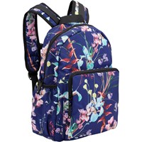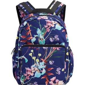 Rummelig rygsæk i blå med blomster print. Rygsækkens materiale er fremstillet af recycled polyester. Rygsækken har en udvendig frontlomme med lynlås og 'M-3' label, lommer i begge sider til eksempelvis en drikkedunk, vatteret ryg, strop til ophæng samt justerbare skulderstropper.