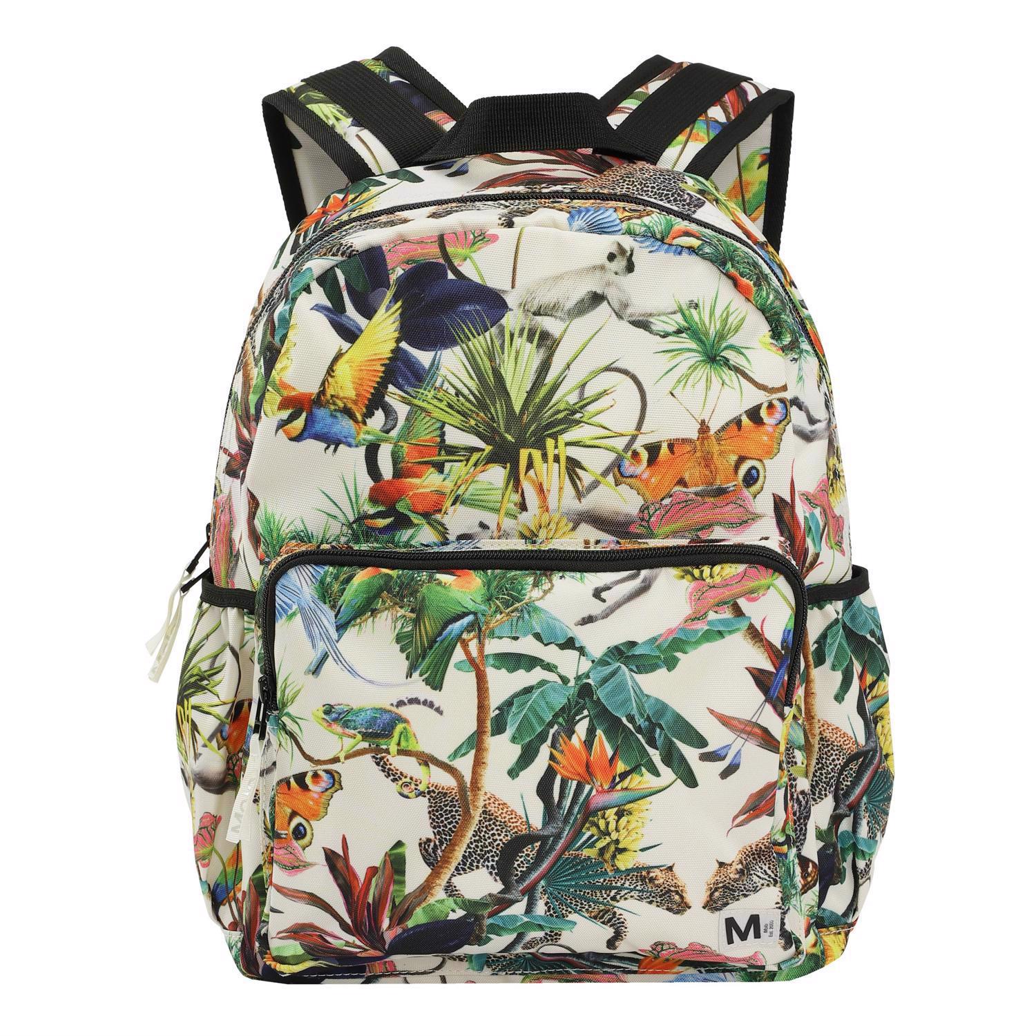 Beige rygsæk i farvestrålende tropisk print med sommerfugle, planter og jungledyr. Rygsækken har en udvendig frontlomme med lynlås, lommer i begge sider til eksempelvis en drikkedunk, vatteret ryg, strop til ophæng samt justerbare skulderstropper og en indvendig lomme.