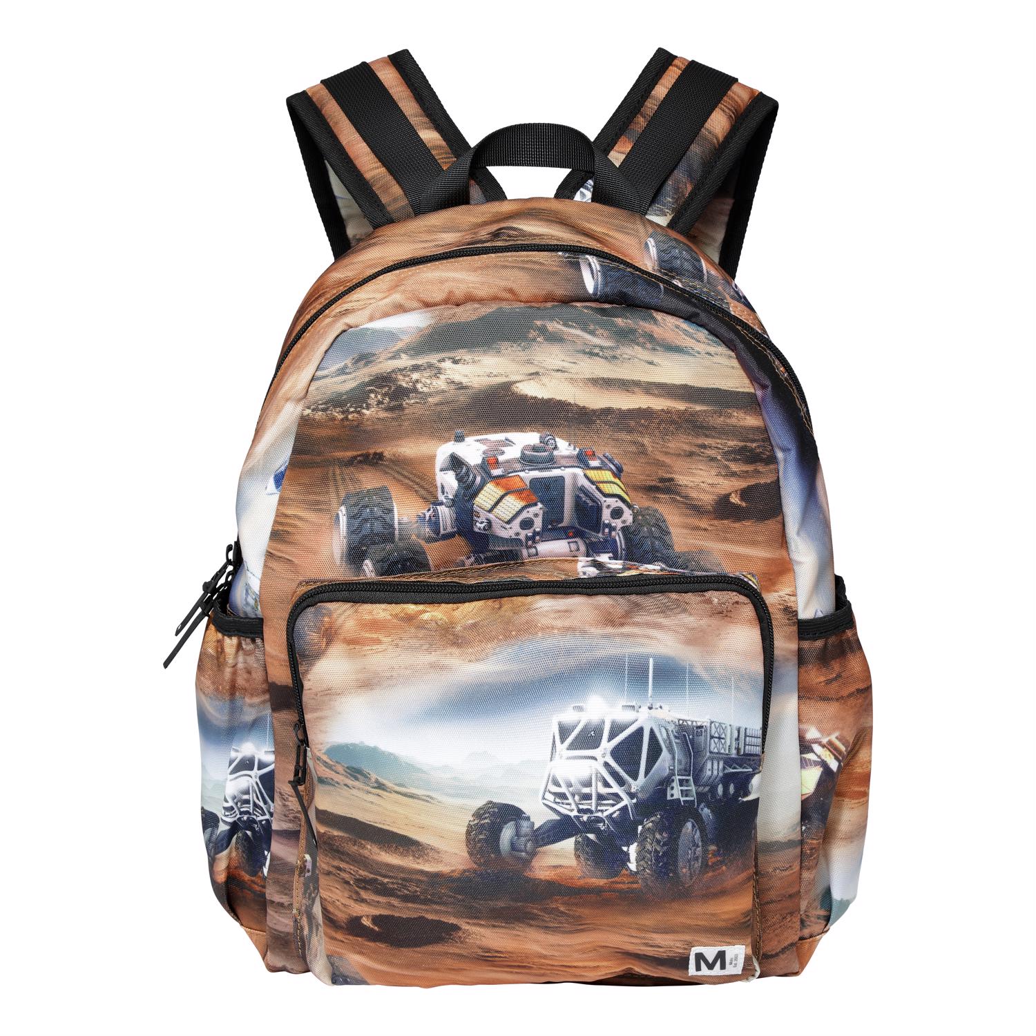 Rummelig rygsæk med print af Mars. Rygsækkens materiale er fremstillet af recycled polyester. Rygsækken har en udvendig frontlomme med lynlås, lommer i begge sider til eksempelvis en drikkedunk, vatteret ryg, strop til ophæng samt justerbare skulderstropper. Dette Molo produkt er recycled og fremstillet af genanvendeligt polyester, som er produceret af brugte plastikflasker og andet restaffald. Produktionen af genanvendt polyester kræver langt færre ressourcer og udleder mindre CO2, hvorfor Molo’s recycled rygsække er det bæredygtige valg.