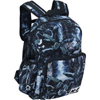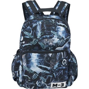 Rummelig rygsæk i blå med print af junglens dyr i månskin. Rygsækkens materiale er fremstillet af recycled polyester. Rygsækken har en udvendig frontlomme med lynlås og 'M-3' label, lommer i begge sider til eksempelvis en drikkedunk, vatteret ryg, strop til ophæng samt justerbare skulderstropper.