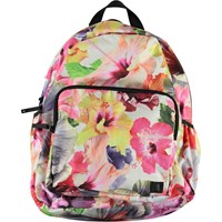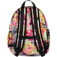Rummelig rygsæk med blomster print. Rygsækken har en udvendig frontlomme med lynlås, lommer i begge sider til eksempelvis en drikkedunk, vatteret ryg, strop til ophæng samt justerbare skulderstropper.