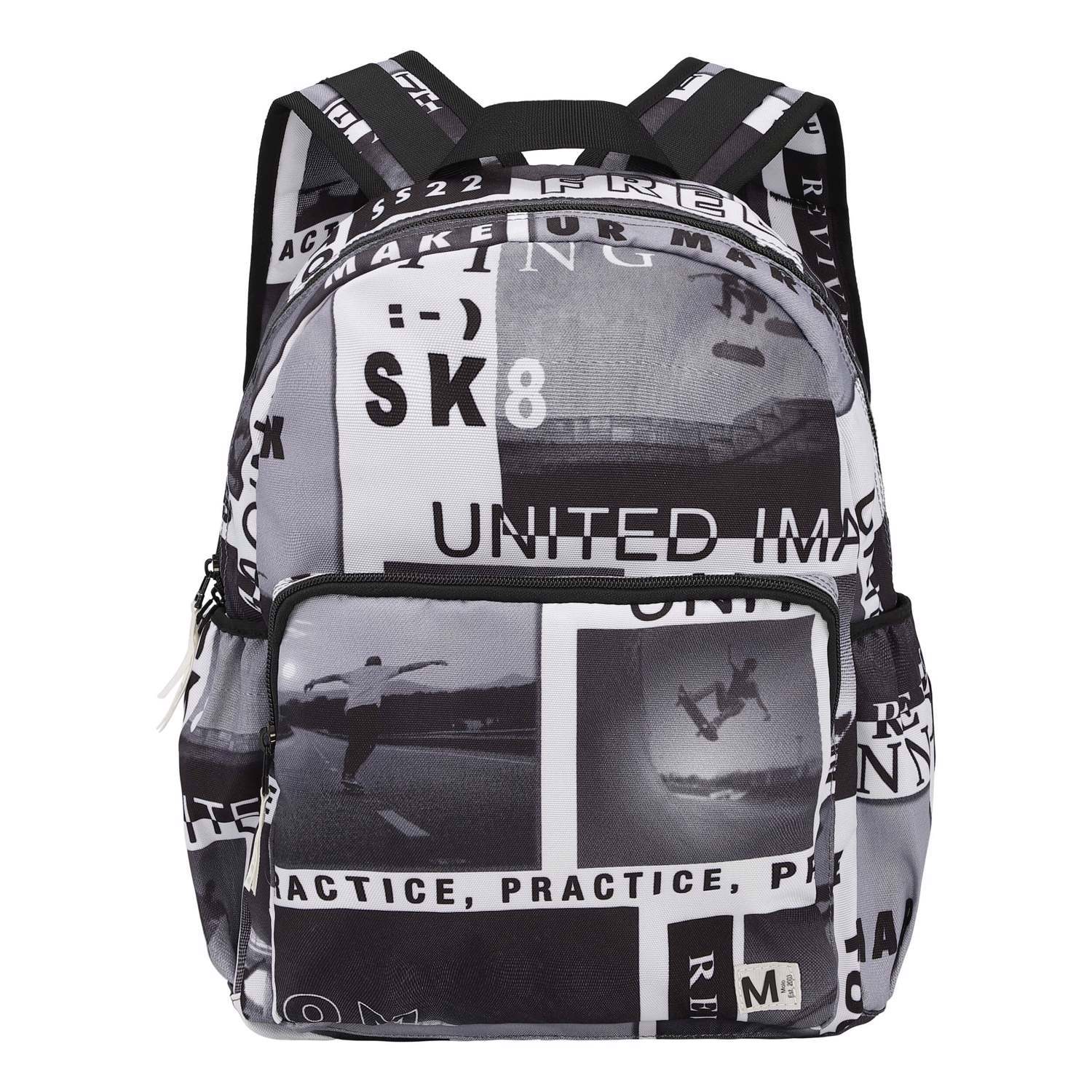 Rummelig rygsæk i sort/hvid print og tekst med skate-referencer. Rygsækken har en udvendig frontlomme med lynlås, lommer i begge sider til eksempelvis en drikkedunk, vatteret ryg, strop til ophæng samt justerbare skulderstropper og en indvendig lomme.