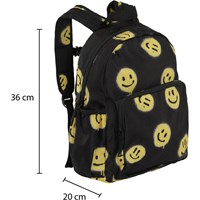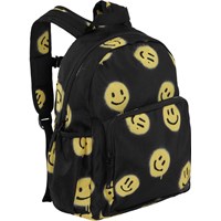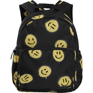 Rummelig sort rygsæk med sprayprintede gule smileys. Rygsækkens materiale er fremstillet af recycled polyester. Rygsækken har en udvendig frontlomme med lynlås, lommer i begge sider til eksempelvis en drikkedunk, vatteret ryg, strop til ophæng samt justerbare skulderstropper og en indvendig lomme. Dette Molo produkt er recycled og fremstillet af genanvendeligt polyester, som er produceret af brugte plastikflasker og andet restaffald. Produktionen af genanvendt polyester kræver langt færre ressourcer og udleder mindre CO2, hvorfor Molo’s recycled rygsække er det bæredygtige valg. Tasken måler 17cm. x 39cm. x 32cm.