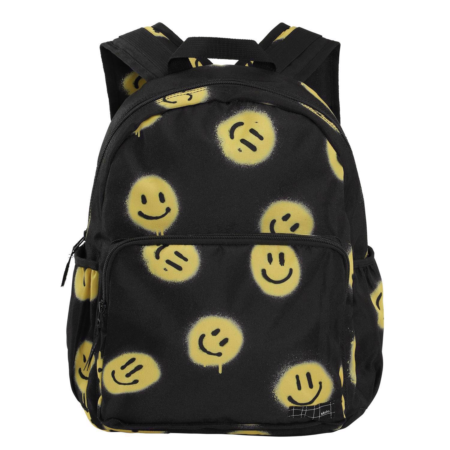 Rummelig sort rygsæk med sprayprintede gule smileys. Rygsækkens materiale er fremstillet af recycled polyester. Rygsækken har en udvendig frontlomme med lynlås, lommer i begge sider til eksempelvis en drikkedunk, vatteret ryg, strop til ophæng samt justerbare skulderstropper og en indvendig lomme. Dette Molo produkt er recycled og fremstillet af genanvendeligt polyester, som er produceret af brugte plastikflasker og andet restaffald. Produktionen af genanvendt polyester kræver langt færre ressourcer og udleder mindre CO2, hvorfor Molo’s recycled rygsække er det bæredygtige valg. Tasken måler 17cm. x 39cm. x 32cm.