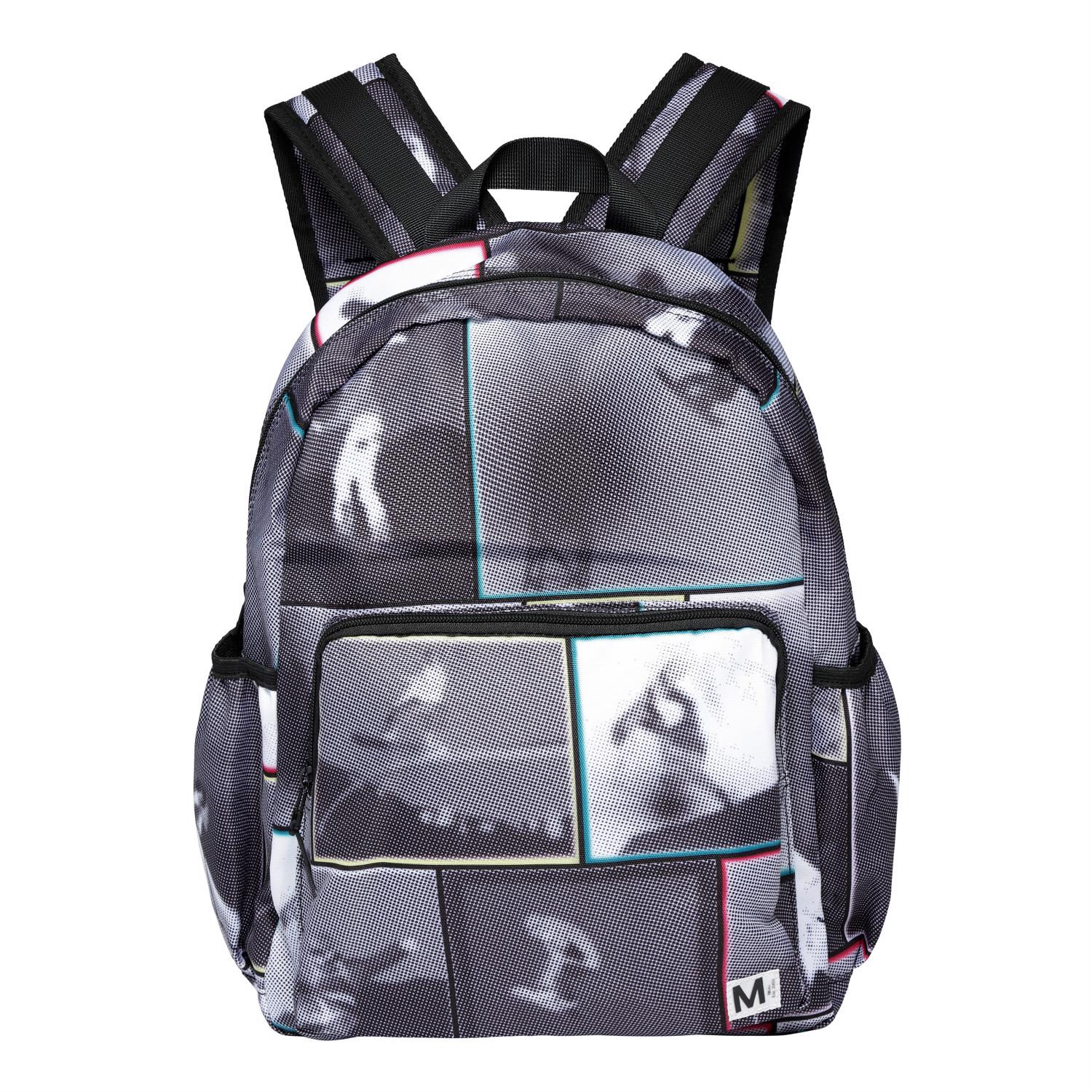 Rummelig rygsæk med gråtonet print af snowboarder. Rygsækken har en udvendig frontlomme med lynlås, lommer i begge sider til eksempelvis en drikkedunk, vatteret ryg, strop til ophæng samt justerbare skulderstropper.