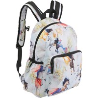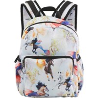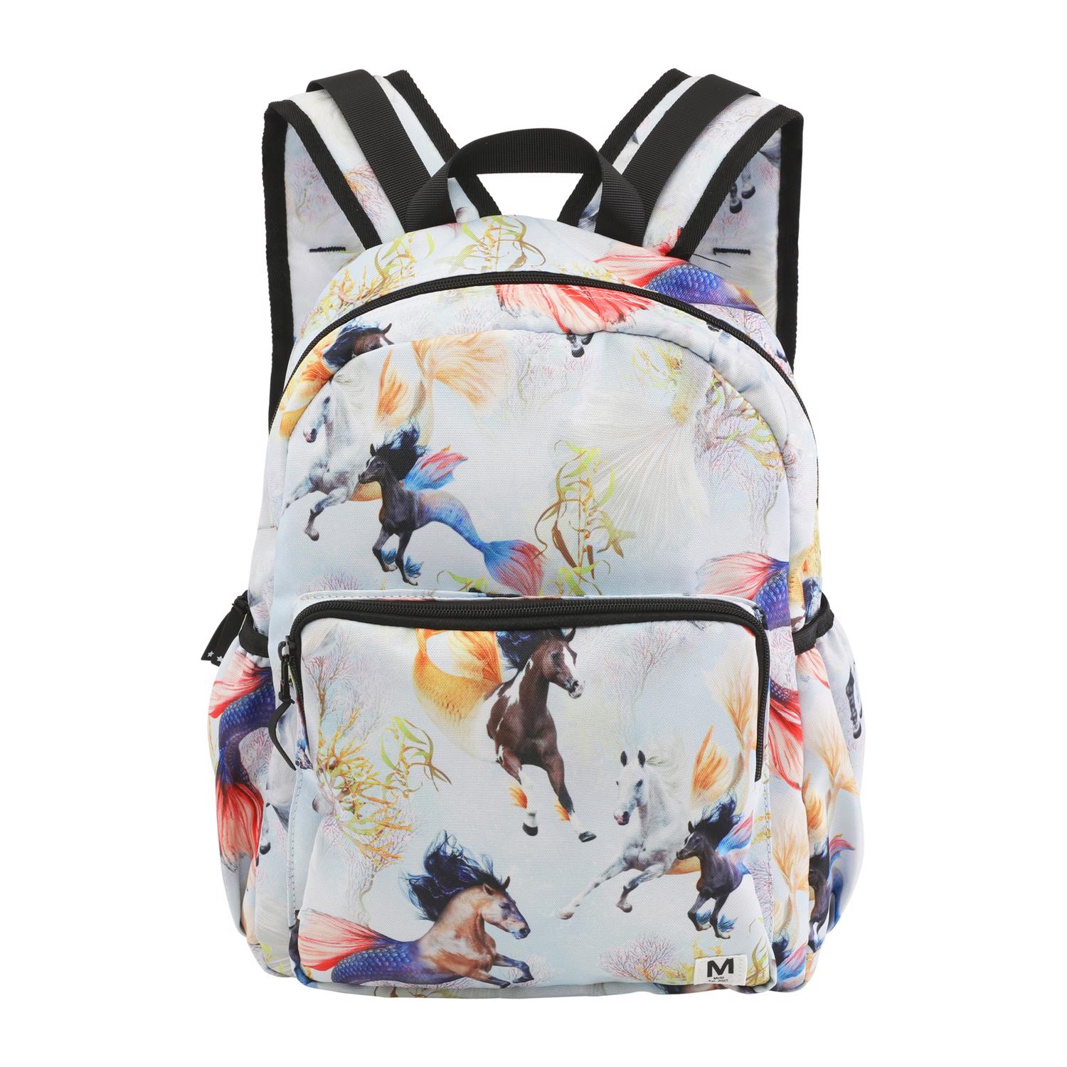 Rummelig lyseblå rygsæk med søheste print. Rygsækkens materiale er fremstillet af recycled polyester. Rygsækken har en udvendig frontlomme med lynlås, lommer i begge sider til eksempelvis en drikkedunk, vatteret ryg, strop til ophæng samt justerbare skulderstropper. Dette Molo produkt er recycled og fremstillet af genanvendeligt polyester, som er produceret af brugte plastikflasker og andet restaffald. Produktionen af genanvendt polyester kræver langt færre ressourcer og udleder mindre CO2, hvorfor Molo’s recycled rygsække er det bæredygtige valg.