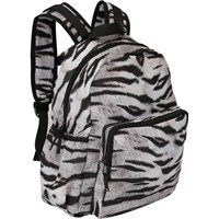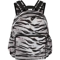 Rummelig rygsæk med sort og hvidt tiger print. Rygsækkens materiale er fremstillet af recycled polyester. Rygsækken har en udvendig frontlomme med lynlås, lommer i begge sider til eksempelvis en drikkedunk, vatteret ryg, strop til ophæng samt justerbare skulderstropper. Dette Molo produkt er recycled og fremstillet af genanvendeligt polyester, som er produceret af brugte plastikflasker og andet restaffald. Produktionen af genanvendt polyester kræver langt færre ressourcer og udleder mindre CO2, hvorfor Molo’s recycled rygsække er det bæredygtige valg.