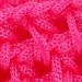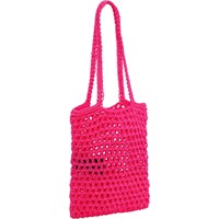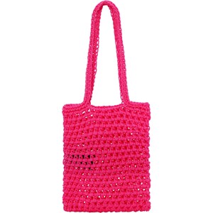 Lille, pink skuldertaske, hæklet af et robust polyestergarn. Tasken er uforet og har en åben top med skulderstropper. Måler 21 cm i bredden og 25 cm i højden.