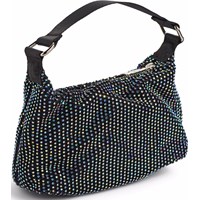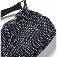 Sort taske med flotte similisten og sort hank. Tasken måler 18 cm i bredden og 13 cm i højden uden strop.