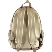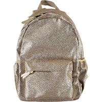 Rummelig guld farvet rygsæk med glimmer. Rygsækken har en udvendig frontlomme med lynlås, lommer i begge sider til eksempelvis en drikkedunk, vatteret ryg, strop til ophæng samt justerbare skulderstropper.