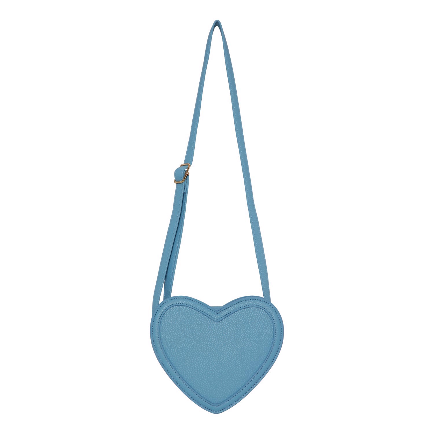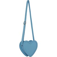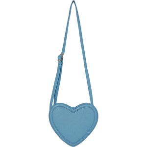Blå, hjerteformet taske i imiteret læder med justerbar skulderrem og lynlås.